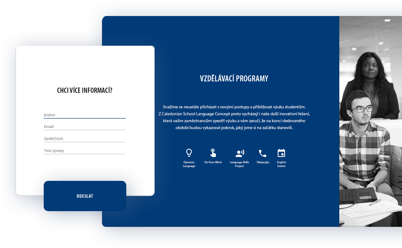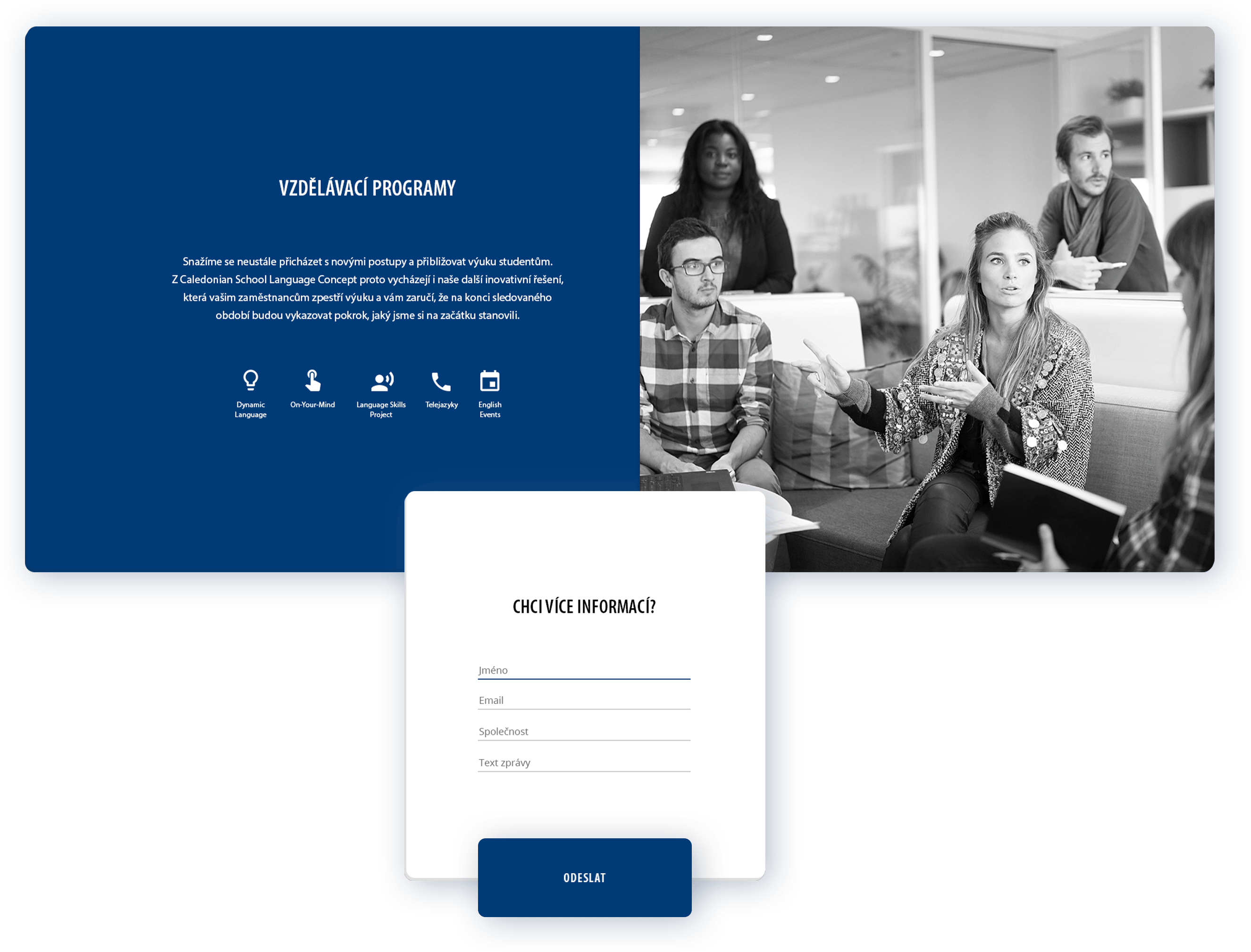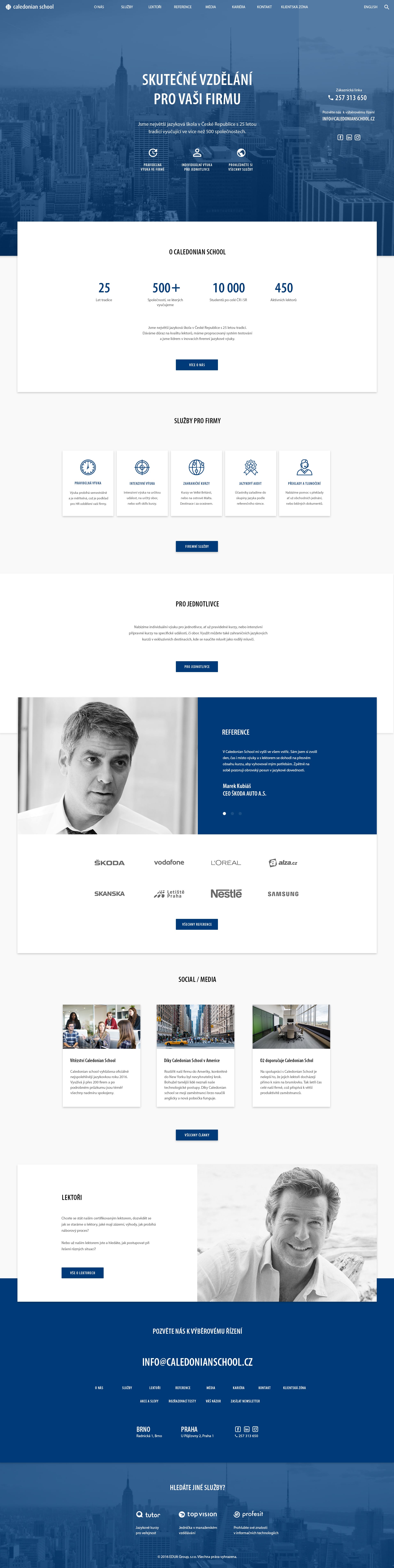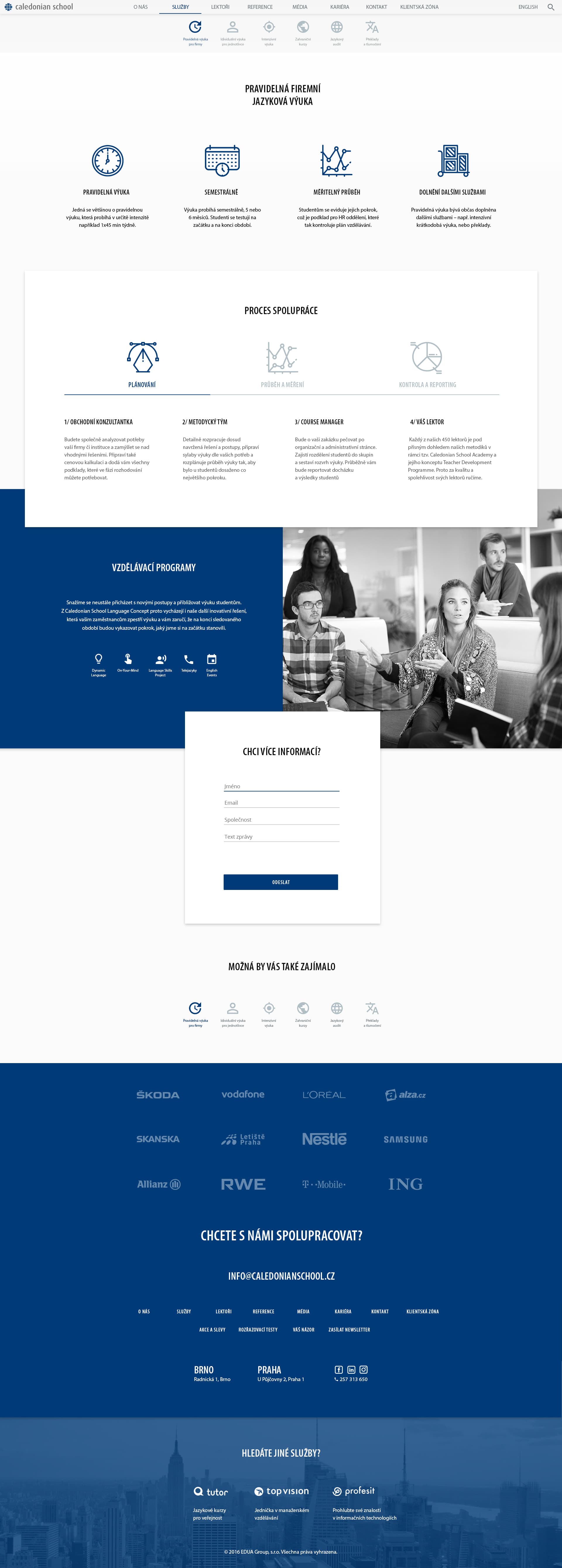 Caledonian School is the biggest language school in the Czech Republic specialized in the area of corporate education. The team VA FIGHTERS was tasked to design a draft of a new web which would support the brand and its prominent market position. The first and essential step was to completely redesign the web of the company, so it could provide the target group with a unified summary of the services offered and references.